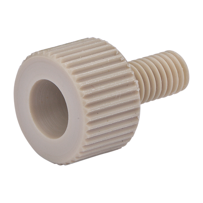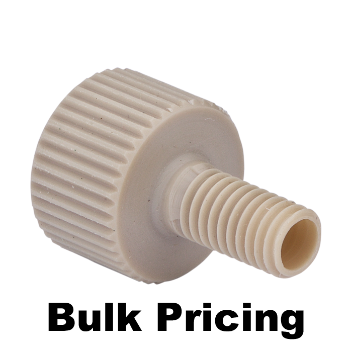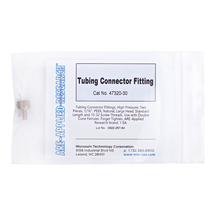 Tubing connector fittings, high pressure, two pieces, 1/16 inch, PEEK, natural, large head, standard length and 10-32 screw threads. Use with double cone ferrules. Finger tighten, ARE-Applied Research brand. Bulk Price.