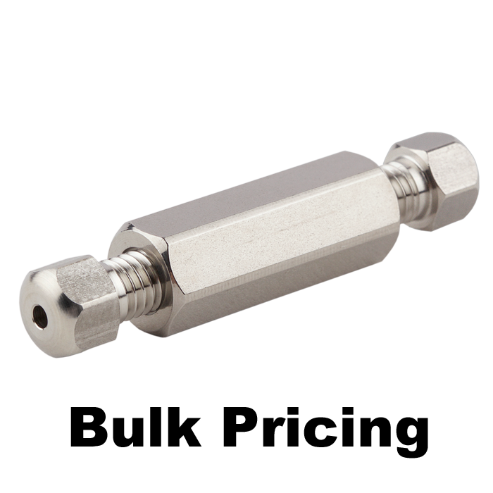 Union, Connector Kit, high pressure, 0.50 mm / 0.020 inch through hole with 10-32 mm screw threads. Stainless steel, straight line. Use with 1/16 inch tubing. ARE-Applied Research brand. Bulk Price.