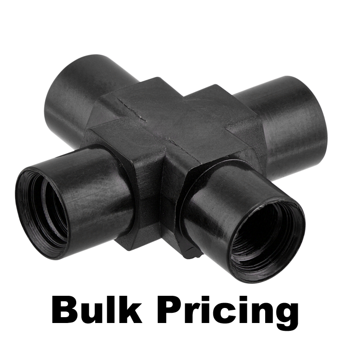 Union, Connector, Cross, high pressure, 1.0 mm / 0.040 inch through hole with 1/4-28 screw threads, Carbon PEEK Endure, Round with an Internal X. Use with 1/16 tubing. ARE-Applied Research brand. Bulk Price.