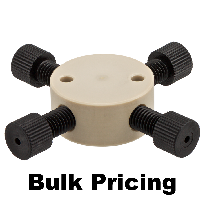 Union, Connector Kit, Cross, high pressure, 0.8 mm / 0.031 inch through hole with 1/4-28 screw threads. PEEK, round with an internal "X" flow pattern. Use with 1/16 inch tubing. ARE-Applied Research brand. Bulk Price.
