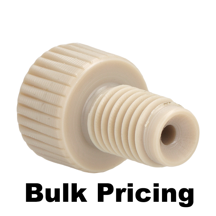 Tubing Connector Nuts, low pressure, 1/16 inch, PEEK, Natural with 1/4-28 screw threads, for use with flange free, polymeric tubing. ARE-Applied Research brand. Bulk Price.