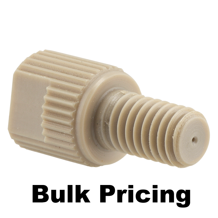 This all-PEEK adapter has a 1/4-28 threaded female port on one side and a European style M6 screw thread male connector on the other side.