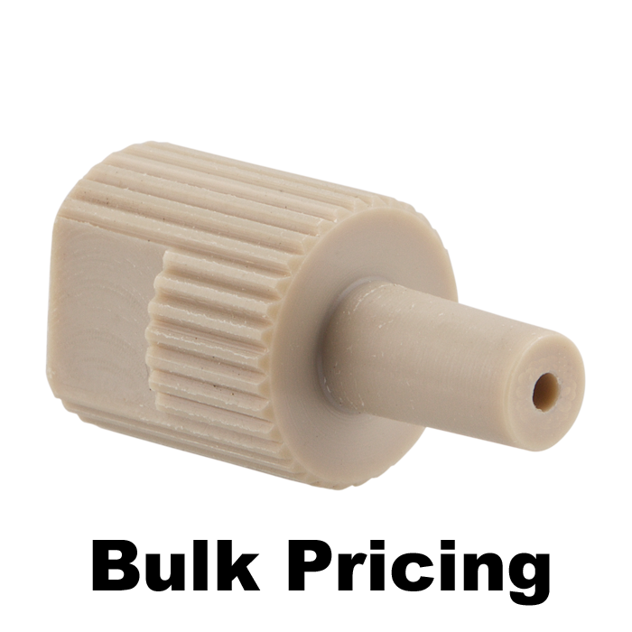 This wider bore, all-PEEK adapter has a 10-32 threaded female port on one side and a male Luer slip connector on the other side.