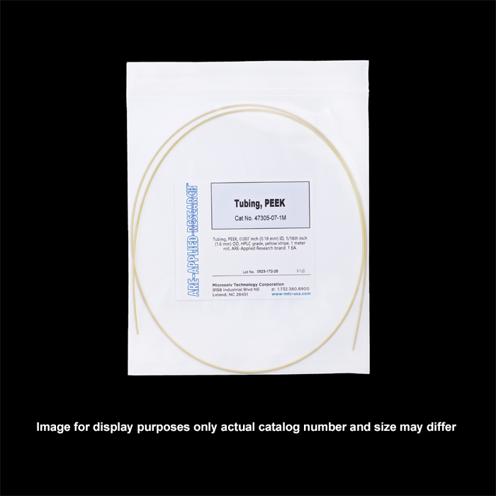 You determine the length of this HPLC grade tubing that is extruded from virgin PEEK material without any manufacturing additives. The yellow stripe is added only to the outside of the tubing, leaving the interior all natural PEEK which eliminates leachables due to color.
