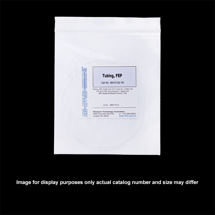 Tubing, FEP, 0.030 inch (0.75 mm) ID, 1/16th inch (1.6 mm) OD, low pressure, Your continuous length tubing, priced per meter. ARE-Applied Research brand.