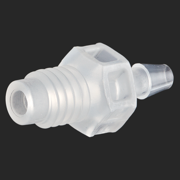 Adapter, for use with low pressure. Barbed connection for 3/32 inch tubing to M6 male connection. Polypropylene. ARE-Applied Research brand. Bulk Price.