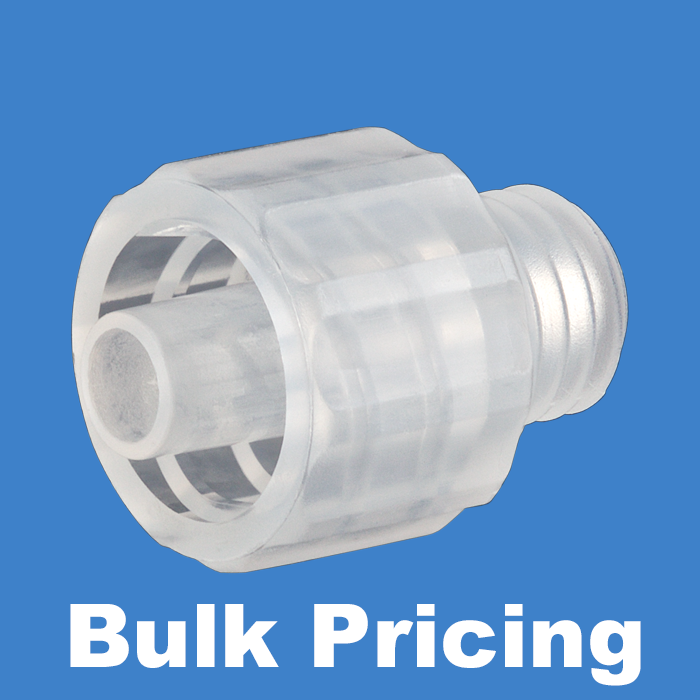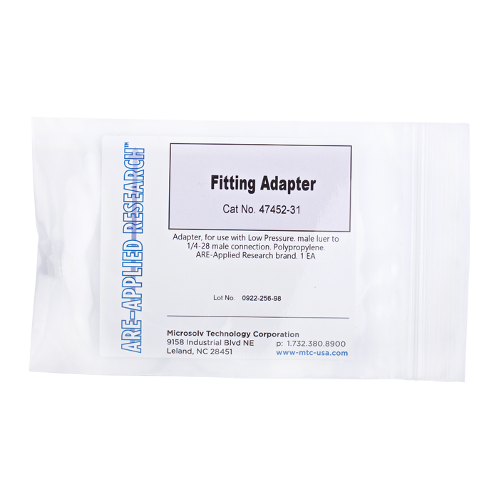 Adapter, for use with low pressure. Male luer to 1/4-28 male connection. Polypropylene. ARE-Applied Research brand. Bulk Price.