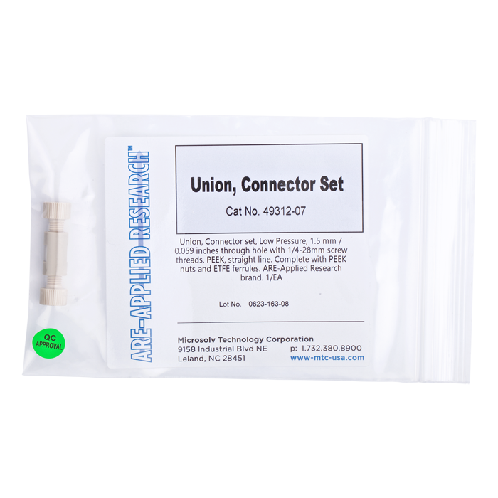 Union, Connector set, low pressure, 1.5 mm / 0.060 inch through hole with 1/4-28 screw threads. PEEK, straight line. Complete with PEEK nuts and ETFE ferrules. ARE-Applied Research brand. Bulk Price.